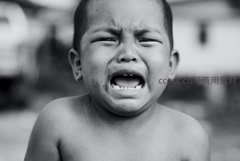 一张充满情感张力的黑白特写照片,捕捉到一个年幼男孩因伤心而放声大哭的瞬间,面部表情极具感染力,背景虚化突出主体。