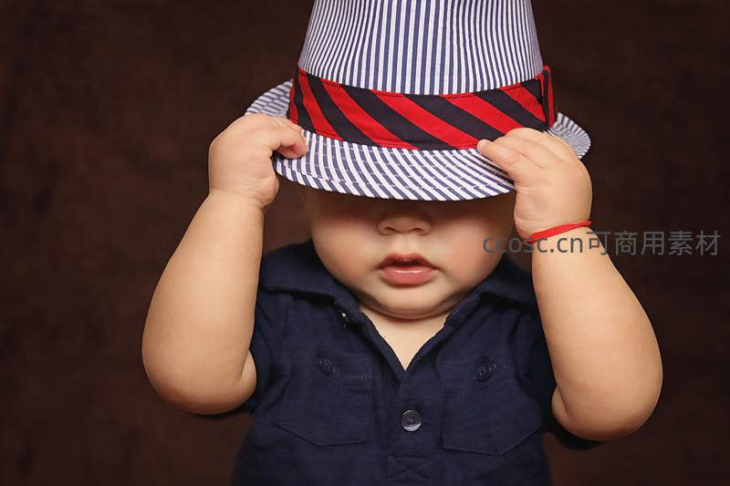 胖乎乎的宝宝戴着蓝白条纹礼帽,双手扶帽檐遮住眼睛,只露出红润嘴唇和圆润脸颊,造型俏皮又惹人喜爱。