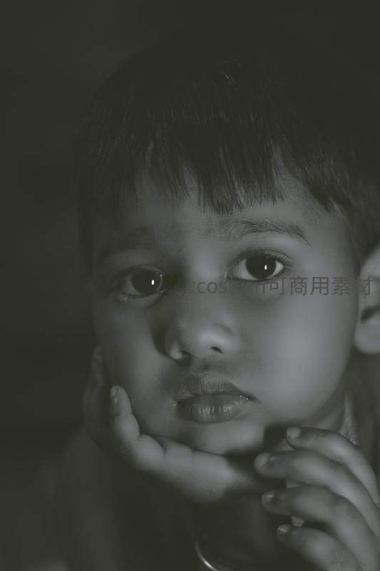 黑白光影下男孩托腮沉思特写