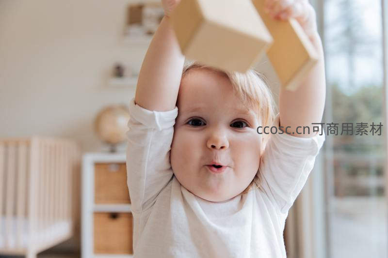 一个穿着白色上衣的宝宝高举两个木质积木,张着小嘴,眼神专注,背景是温馨的卧室环境,展现孩子探索与快乐的童年时光。