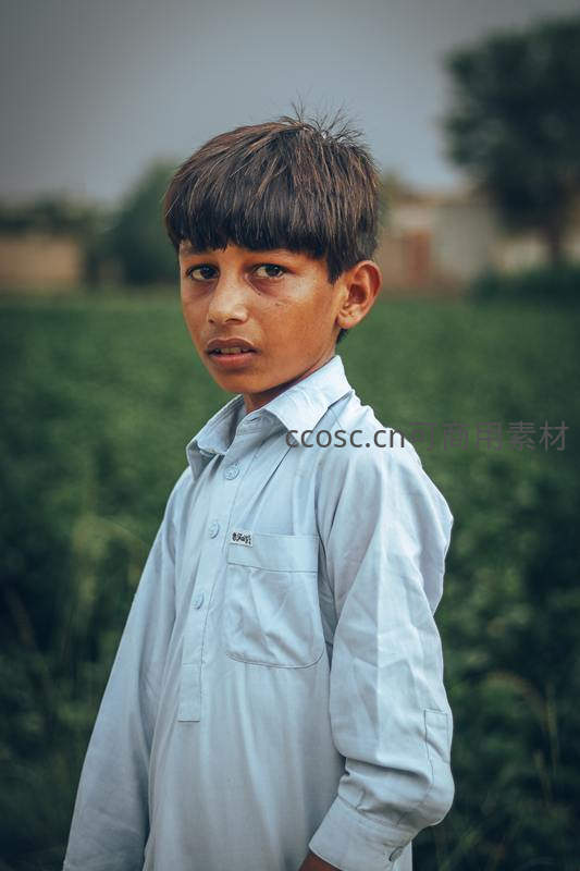 一个身穿浅色衬衫的少年站在绿意盎然的田野前,眼神专注而深邃,背景是模糊的农舍与树木,充满宁静的乡村气息。