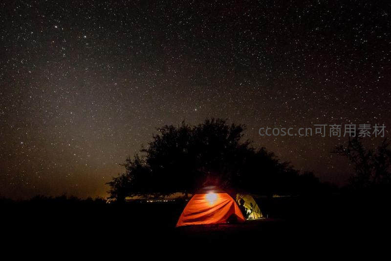 在漫天繁星的温柔注视下,一顶橙色的露营帐篷内透出温暖的光芒,旁边是静默的树木,整个画面充满了户外生活的惬意与安宁。