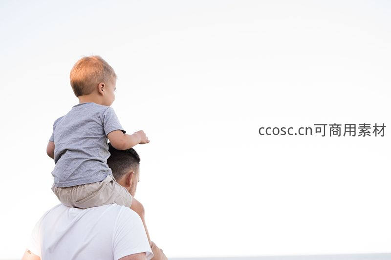 小男孩坐在父亲肩膀上,好奇地望向远方,纯白背景突出亲情主题,展现父爱如山与童年无忧的幸福时光。