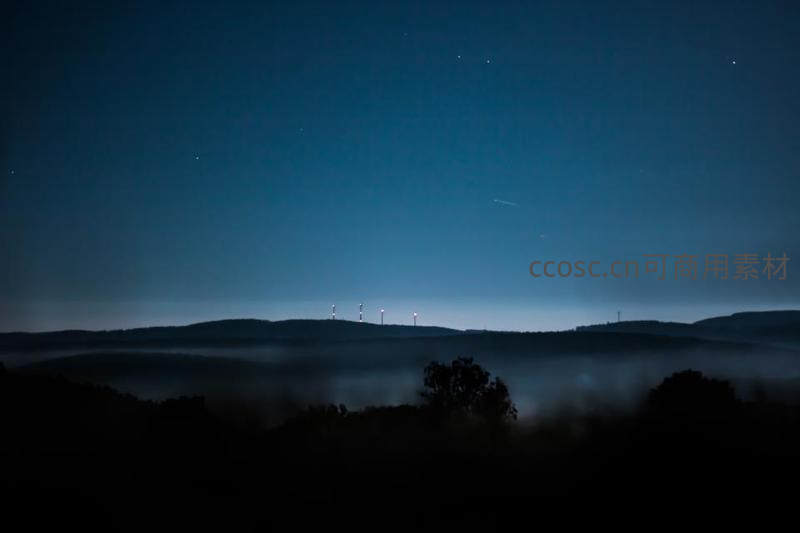 薄雾笼罩山谷,风车剪影点缀星空之下