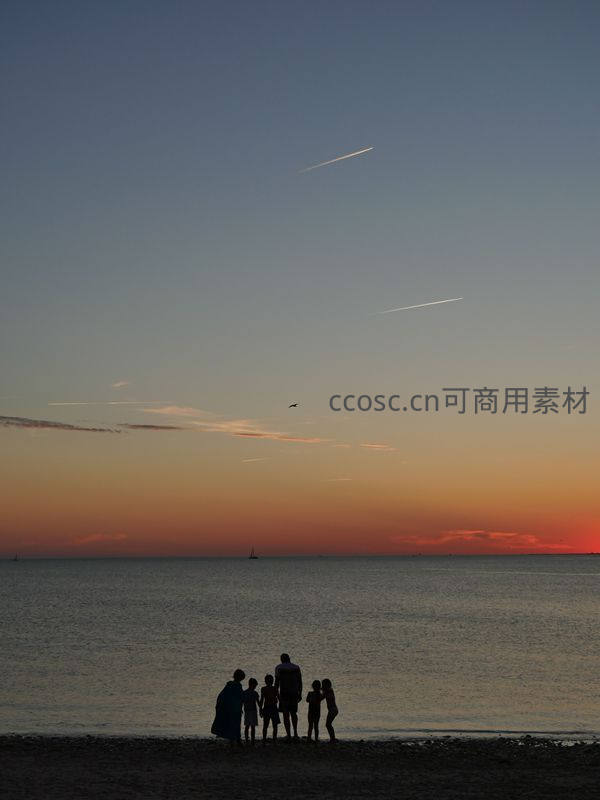 一家人在黄昏时分伫立沙滩,背对镜头凝望绚烂晚霞,海天一色间飞机划过长空留下航迹,静谧中透出浓浓的亲情与诗意。