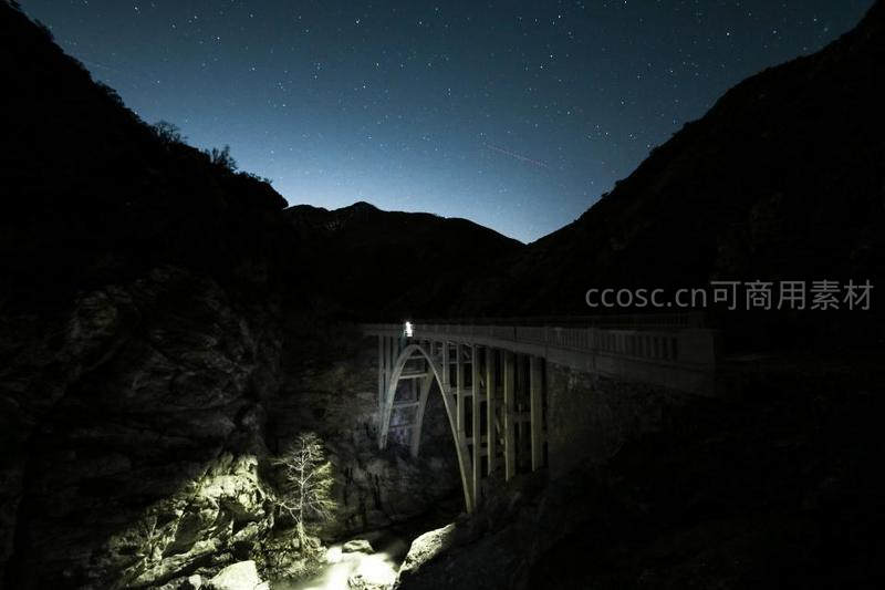 一座宏伟的拱桥横跨幽暗峡谷,桥身被暖光点亮,与头顶繁星点点的夜空形成鲜明对比,展现人造奇迹与自然星空的和谐共存。