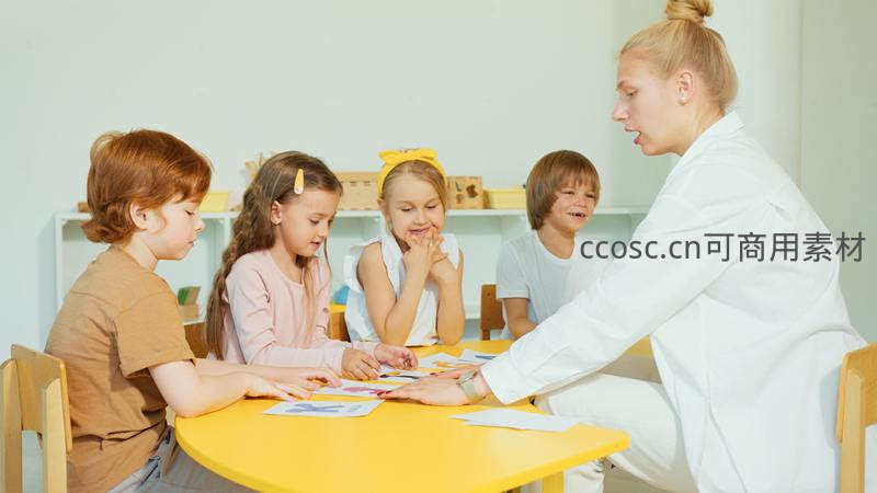 一位女教师正与四名儿童围坐在黄色桌子旁,指导他们进行手工或识字活动,氛围温馨专注,体现寓教于乐的早期教育场景。