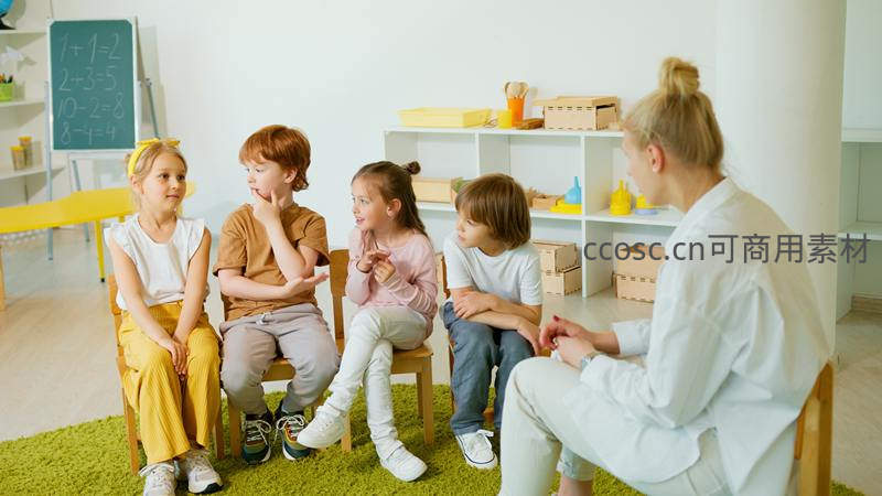 老师蹲在四名儿童面前,引导他们进行小组交流,背景黑板写有算术题,环境明亮整洁,展现启发式教学和儿童积极参与的学习状态。