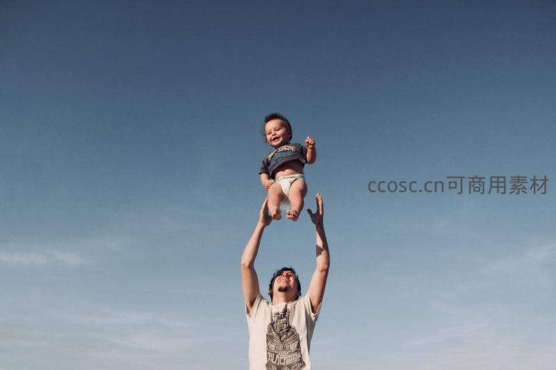 父亲在晴朗蓝天下将婴儿高高举起,孩子张开双臂大笑,画面充满活力与幸福感,象征父爱如山与自由成长的美好瞬间。