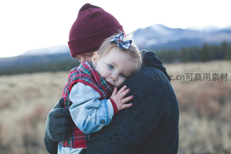 父亲在山野背景下紧紧抱着女儿,小女孩依偎在怀中,眼神温柔,远处雪山朦胧,传递出浓浓的亲情与自然之美。