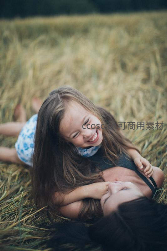 在丰收的麦田中,小女孩趴在母亲身上开怀大笑,阳光洒落,画面充满自然气息与亲密无间的家庭温情。