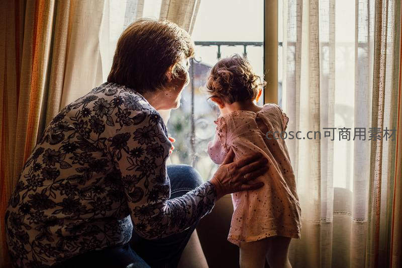 奶奶温柔地搂着小孙女站在窗前,阳光透过薄纱窗帘洒在她们身上,营造出宁静而温暖的氛围,传递着代际之间深厚的情感羁绊。