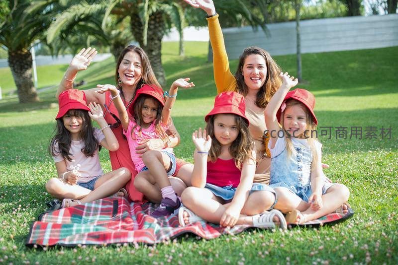 阳光明媚的公园里,几位母亲和孩子们坐在格子野餐垫上,戴着红色帽子,笑容灿烂地向镜头挥手,享受温馨的亲子时光。