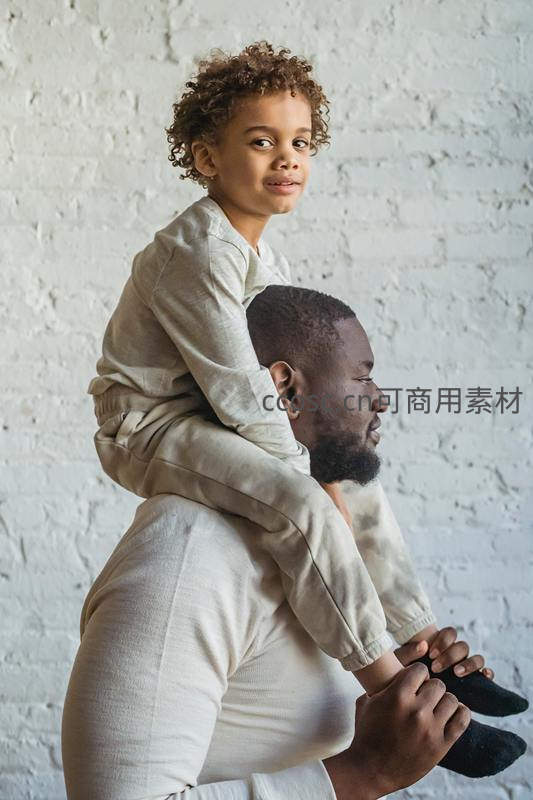 父亲稳稳托住坐在肩上的孩子,孩子回眸一笑,背景是素雅的白色砖墙,画面充满安全感与浓浓的父爱,静谧而动人。