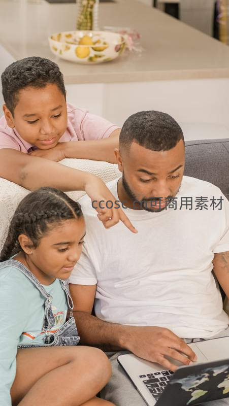 父亲与两个孩子围坐沙发前使用笔记本电脑,共同探讨屏幕内容,营造温馨的学习氛围,促进亲子交流与知识共享。