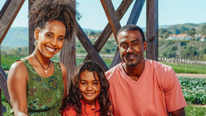一家三口在阳光明媚的田园背景下,站在木质结构前开心微笑,展现了自然与亲情的美好融合。