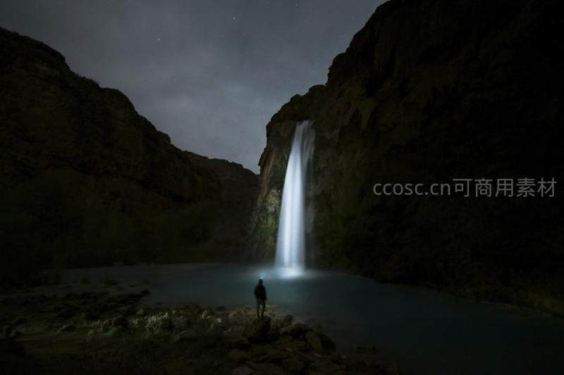 一人伫立在幽暗峡谷中,仰望被灯光照亮的壮观瀑布,头顶是繁星点点的深邃夜空。
