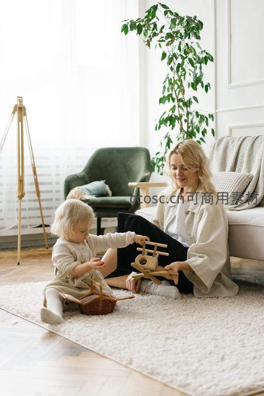 母亲与女儿坐在柔软地毯上共享快乐时光,小女孩专注玩着木制玩具,母亲温柔注视,房间明亮舒适充满爱意。
