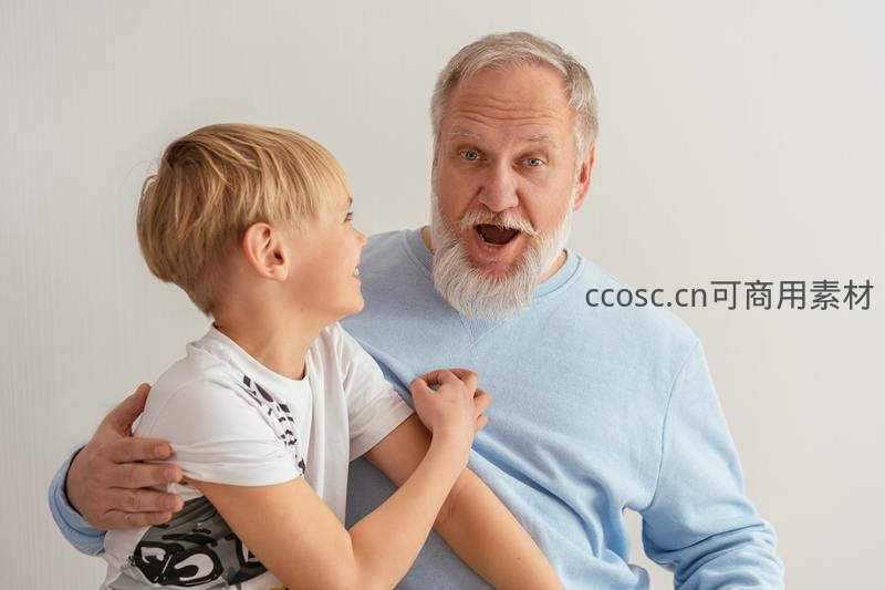 白发爷爷抱着孙子做出夸张惊讶表情,小男孩开心回应,纯真互动流露深厚隔代亲情,画面温暖动人令人会心一笑。