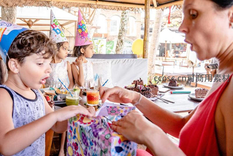 孩子们戴着生日帽围坐桌旁,兴奋拆开五彩礼物,桌上摆满甜点饮料,欢声笑语中共享童年快乐与友谊时光。