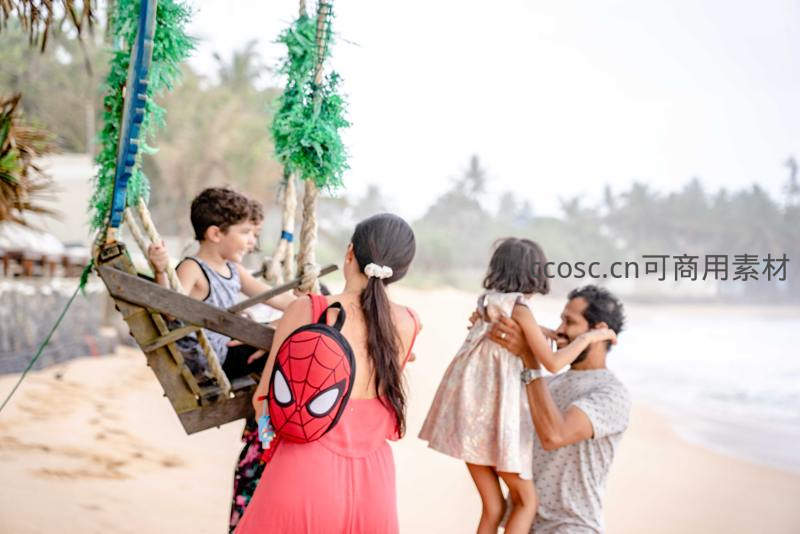 全家海滩度假荡秋千享天伦之乐