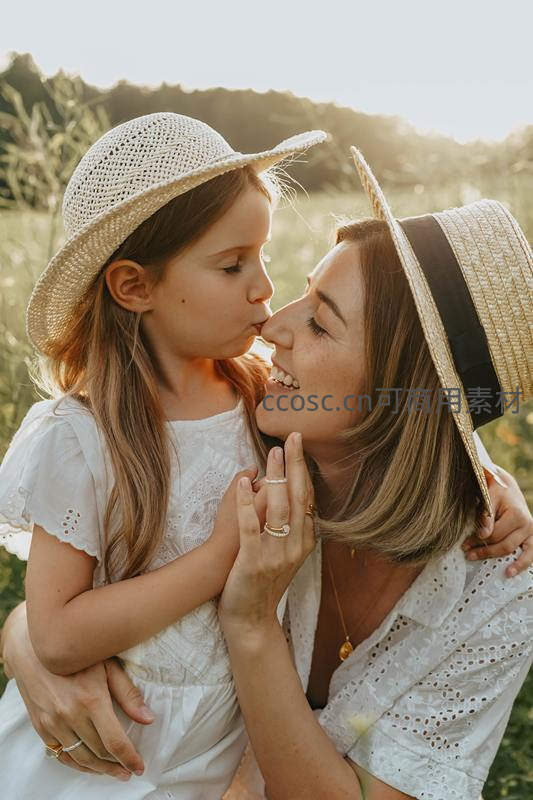 母亲与女儿在金色阳光下戴着草帽亲密相拥,脸颊轻触,笑容灿烂,背景是模糊的田野,充满爱与宁静的家庭氛围。