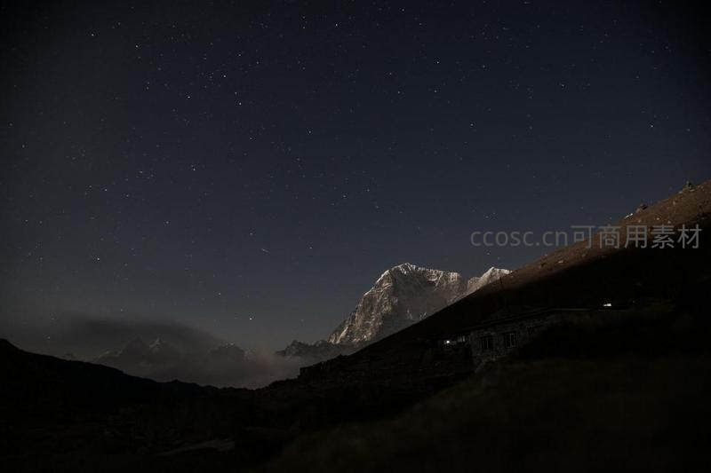 在海拔极高的雪峰脚下,一顶小屋在星光下显得渺小,远方的雪山巍峨耸立,直指苍穹。