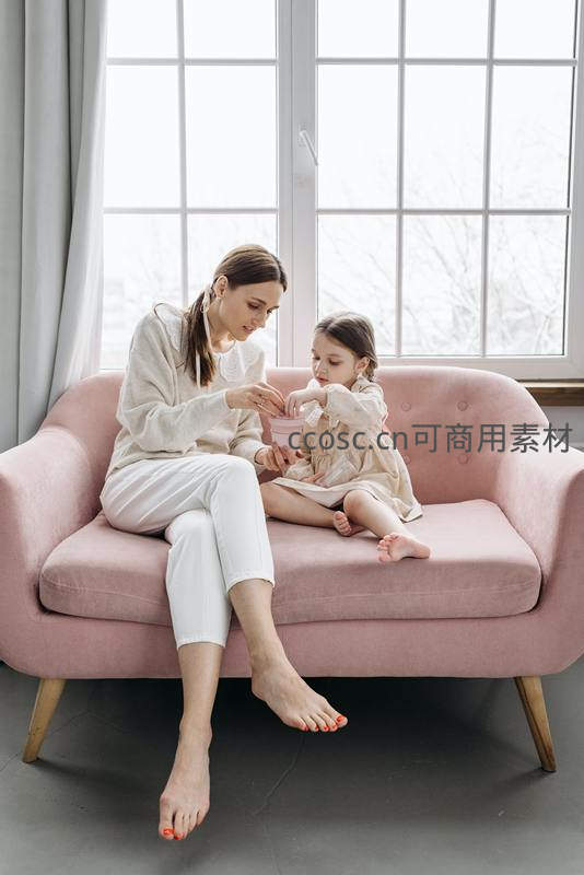 母亲和女儿坐在粉色沙发上,窗外光线柔和,她们共同分享一杯饮品,画面宁静温暖,体现家庭生活的舒适与亲密。