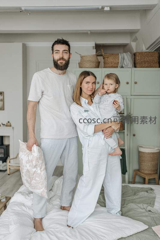 一家三口穿着睡衣站在床上,父亲手拿枕头,母亲抱着婴儿,背景是明亮卧室,展现早晨家庭团聚的温馨与轻松氛围。
