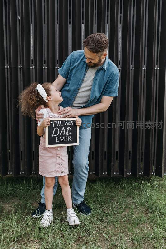 父亲温柔环抱女儿,小女孩举着写有“THE BEST DAD EVER”的小黑板,两人相视而笑,背景是深色竖条栅栏和绿草,充满爱与温馨。
