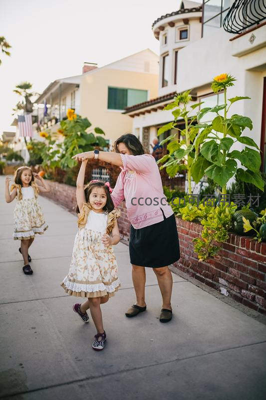 母女嬉戏街头,向日葵旁舞动童年欢笑
