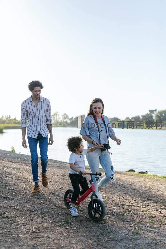 湖畔漫步:孩子骑平衡车父母相伴左右
