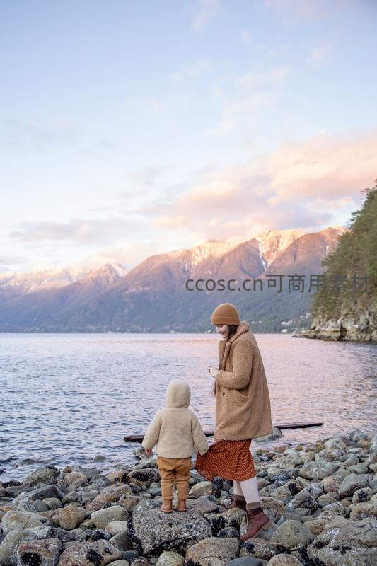 母亲牵着孩子站在湖边的岩石上,远眺夕阳映照下的雪山,水面波光粼粼,天空霞光万丈,构成一幅宁静而壮丽的亲子风景画。