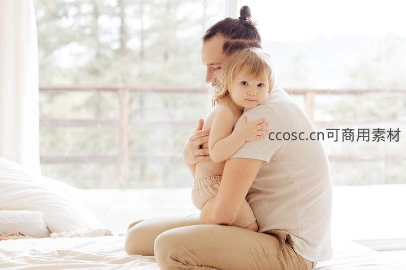 阳光透过窗户洒进卧室,父亲盘腿坐在床上,温柔地将幼儿抱在怀中,孩子依偎着父亲,画面静谧而充满安全感与爱意。