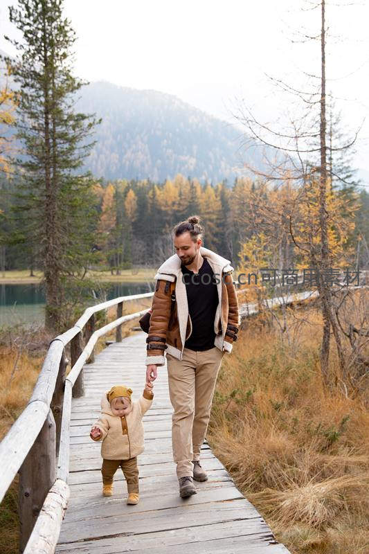 木桥上父女携手漫步秋林