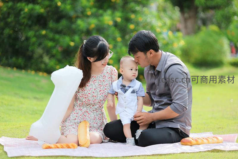 一家三口在绿意盎然的草坪上铺开野餐垫,父母亲昵地围绕着宝宝,面包与棉花糖点缀其间,满溢幸福与自然气息。