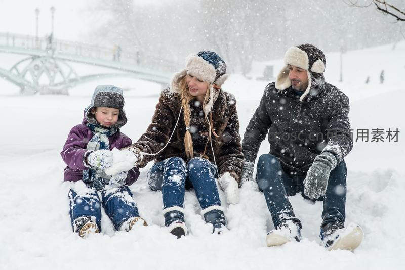 一家三口坐在飘雪的公园雪地上,穿着厚实冬装,脸上洋溢笑容,雪花纷飞营造浪漫氛围,尽显冬日温情与家庭乐趣。