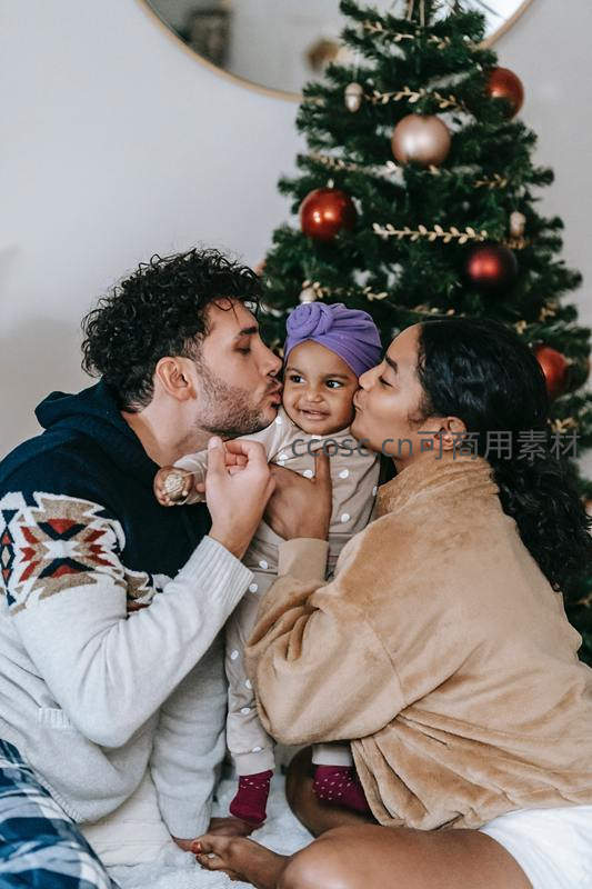 父母在装饰精美的圣诞树前亲吻孩子脸颊,节日气氛浓厚,全家洋溢着幸福与爱意,传递节日团聚的美好情感。