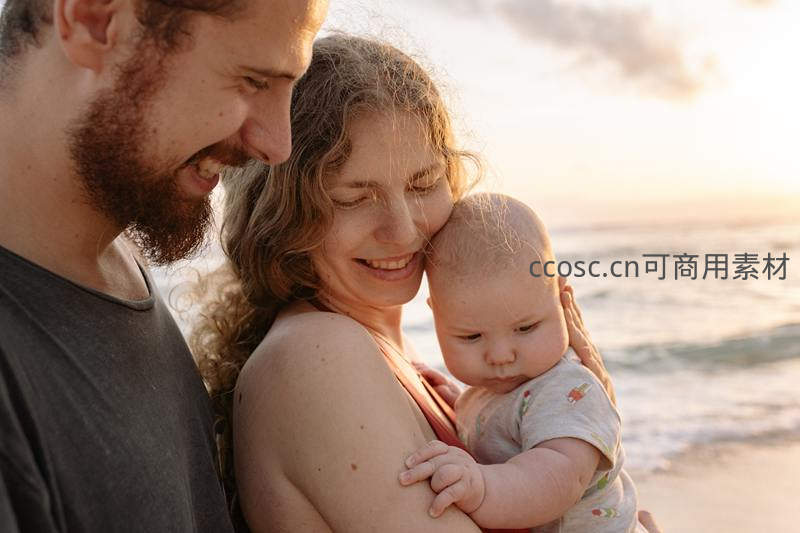 一家三口站在海边,夕阳余晖映照脸庞,父母温柔环抱婴儿,海风轻拂,定格了旅行中温馨而宁静的幸福时刻。