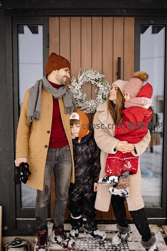 一家四口穿着厚实冬装站在木门前,雪花飘落,母亲怀抱幼童,父亲与儿子相视而笑,背景花环增添节日气氛。