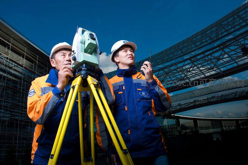 两名工程师在大型建筑工地上使用精密测量设备,神情专注,配合默契,展现现代工程建设中的专业与严谨态度。
