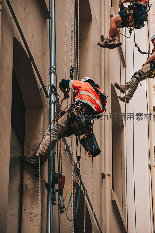 多名穿着反光背心和安全装备的工人借助绳索系统在高楼外墙上进行作业,展现了高危工种的专业技能与无畏精神。