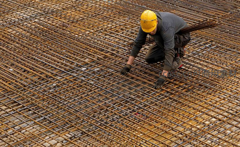 一名头戴黄色安全帽的工人正蹲在纵横交错的钢筋网上,专注地进行绑扎作业,展现了建筑工地上严谨细致的劳动场景。