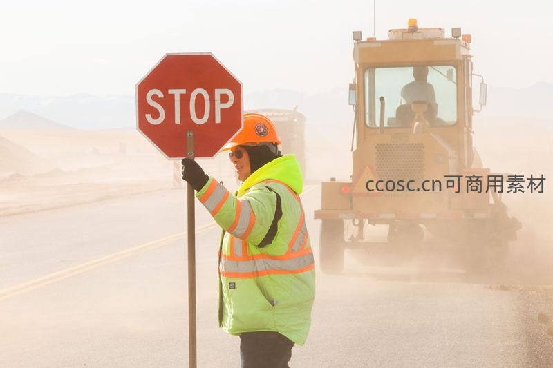 交通指挥员手持停车标志引导施工车辆