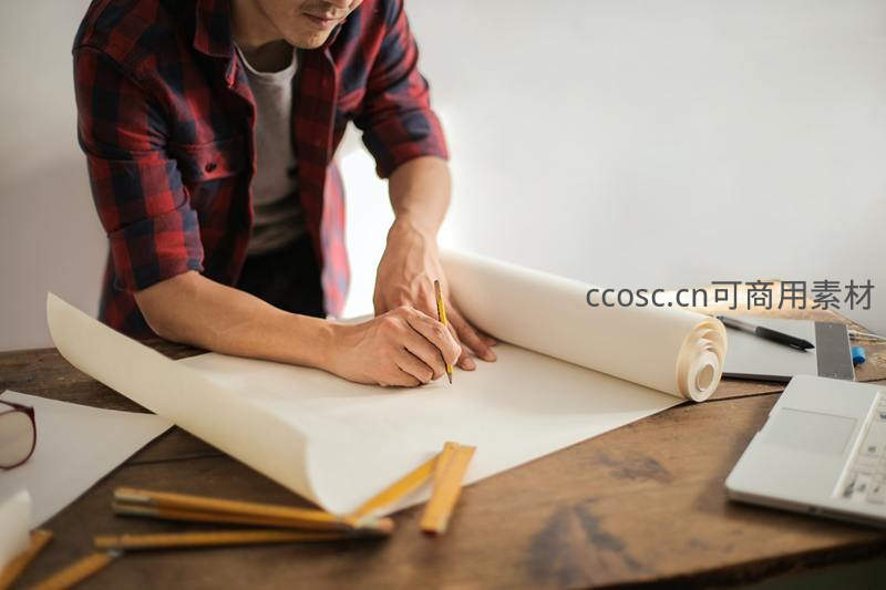 男性设计师身穿红黑格子衬衫,在木质工作台上用铅笔绘制建筑草图,周围散落工具和图纸,体现创作过程中的专注与匠心。