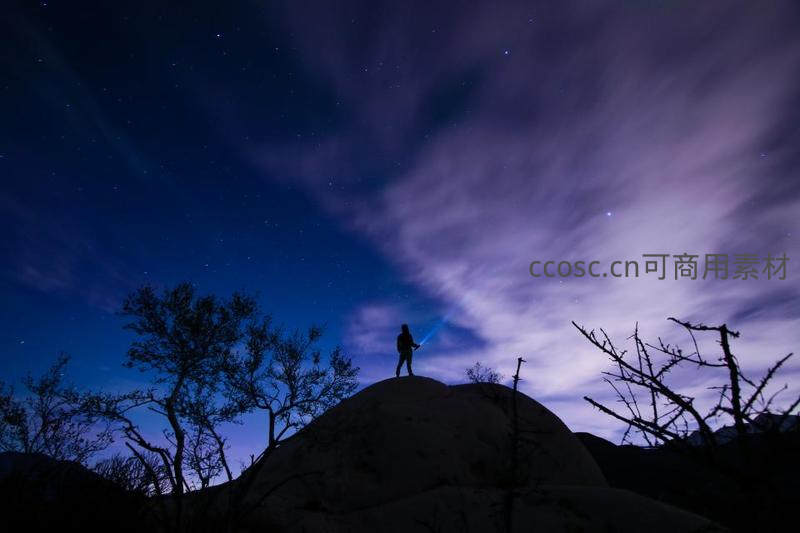 一人伫立山顶,手电光束刺破深蓝夜空,与漫天星辰和流云共舞,展现人类探索未知的渺小与勇敢。