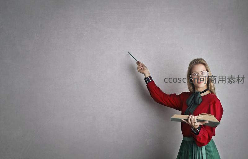 女教师身着红衣绿裙,手持教鞭和书本,正对着一面空白的灰色墙壁进行讲解,营造出充满想象空间的教学场景。