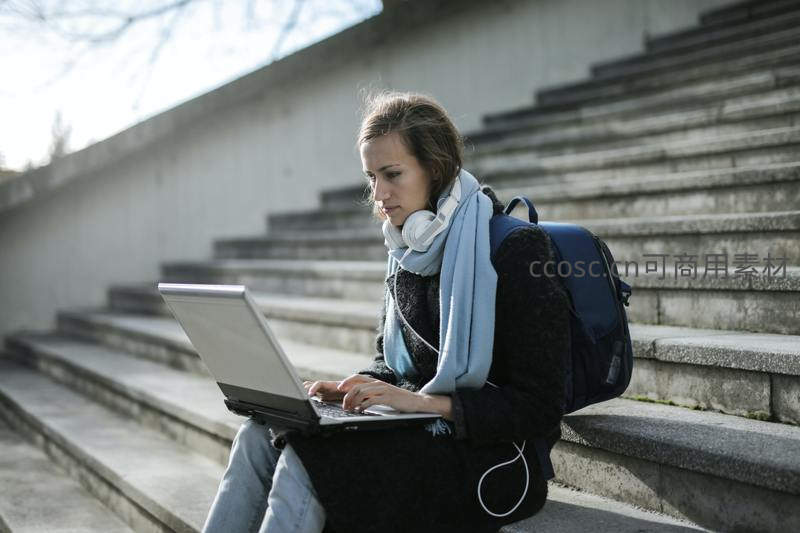 女生户外台阶使用笔记本电脑