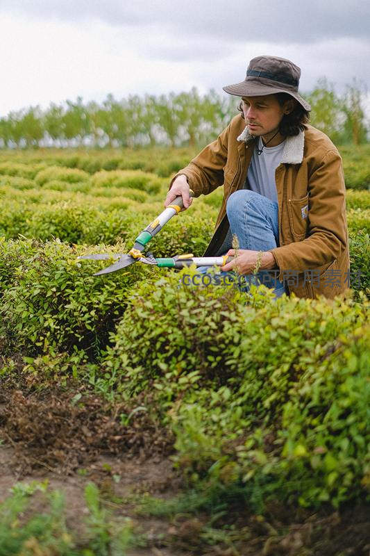 园丁身着工装,蹲在整齐排列的灌木丛旁,手持修枝剪细致修剪,展现园林养护的专业技能与耐心。