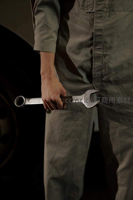 一名身穿工装的技工正握着一把金属扳手,背景隐约可见汽车轮胎,展现了工业维修场景中的专注与力量。